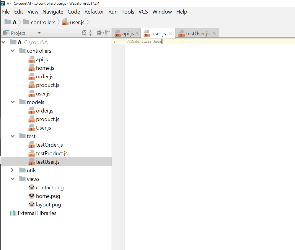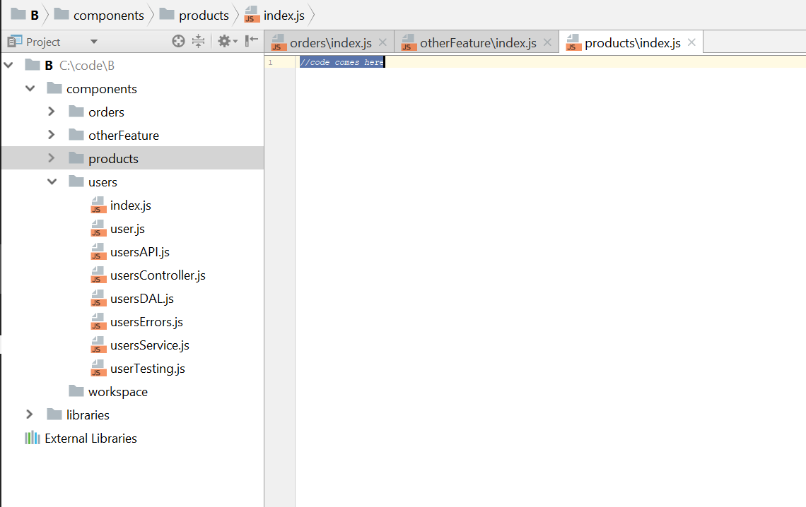 For medium sized apps and above, monoliths are really bad - having one big software with many dependencies is just hard to reason about and often leads to spaghetti code. Even smart architects — those who are skilled enough to tame the beast and 'modularize' it — spend great mental effort on design, and each change requires carefully evaluating the impact on other dependent objects. The ultimate solution is to develop small software: divide the whole stack into self-contained components that don't share files with others, each constitutes very few files (e.g. API, service, data access, test, etc.) so that it's very easy to reason about it. Some may call this 'microservices' architecture — it's important to understand that microservices are not a spec which you must follow, but rather a set of principles. You may adopt many principles into a full-blown microservices architecture or adopt only a few. Both are good as long as you keep the software complexity low. The very least you should do is create basic borders between components, assign a folder in your project root for each business component and make it self-contained - other components are allowed to consume its functionality only through its public interface or API. This is the foundation for keeping your components simple, avoid dependency hell and pave the way to full-blown microservices in the future once your app grows.