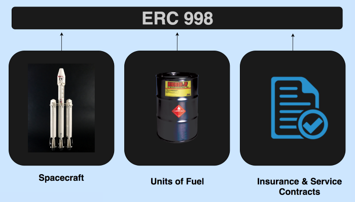 Một ví dụ phức tạp hơn là một con tàu vũ trụ có thể được mô hình hóa theo chuẩn ERC998. Phần thân tàu và các thuộc tính của nó được đại diện bởi token ERC721, các thùng nhiên liệu giống nhau được đại diện bởi các token ERC20, còn bảo hiểm của con tàu có thể được đại diện một token của một chuẩn khác, cả 3 phần được kết hợp với nhau thành một token ERC998. Việc chuyển quyền sở hữu toàn bộ con tàu lúc này chỉ đơn giản là chuyển quyền sở hữu token ERC998.