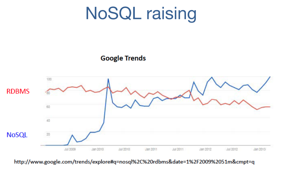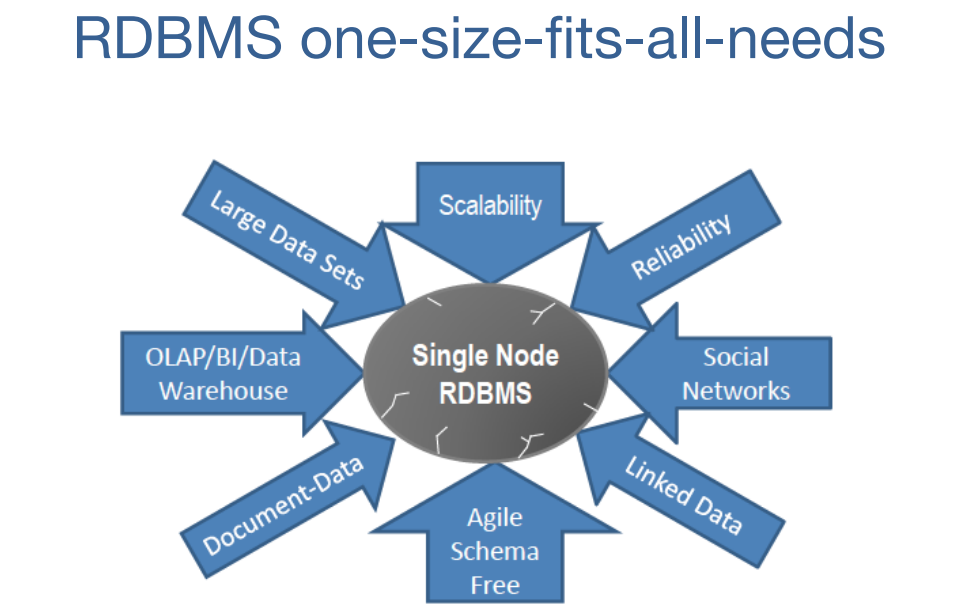 Trước NoSQL thì các lập trình viên DBMS cho rằng: RDBMS là "one size fits all", tạm hiểu là một tiêu chuẩn có thể phù hợp cho tất cả mọi thứ. Nhưng khi các vấn đề thực tế được "công nghệ hóa" ngày càng nhiều thì khẳng định này dần không còn chính xác nữa. Đó là lý do NoSQL ra đời. Hay nói cách khác, NoSQL là giải pháp thay thế, nhằm giải quyết các vấn đề mà RDBMS đang gặp phải.