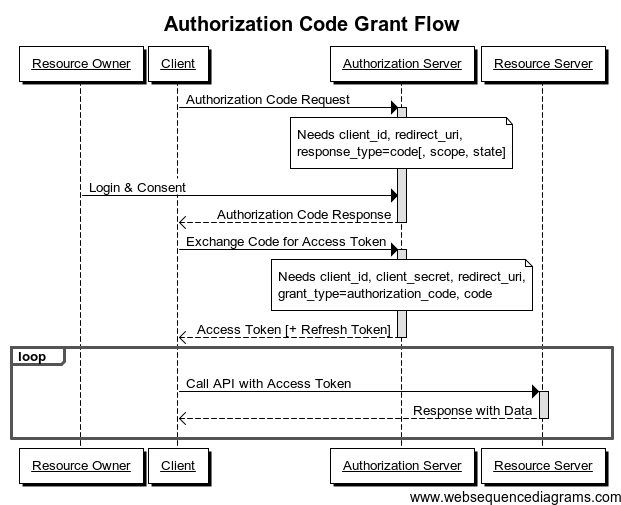 - Một trang web muốn lấy thông tin về hồ sơ trên Google của bạn. Bạn được chuyển hướng bởi khách (trang web) đến máy chủ xác thực (Google). Nếu bạn cho phép truy cập, máy chủ xác thực sẽ gửi mã xác thực (authorization code) đến máy khách (trang web) trong phản hồi (callback response). Sau đó, mã này được trao đổi (exchange) với mã xác thực truy cập giữa máy khách và máy chủ xác thực. Trang web lúc này có thể sử dụng mã xác thực truy cập này để truy vấn máy chủ tài nguyên (Google) và truy xuất dữ liệu hồ sơ của bạn. Bạn không bao giờ nhìn thấy mã xác thực truy cập, nó sẽ được lưu trữ bởi trang web (ví dụ: trong phiên). Google cũng gửi thông tin khác cùng với mã xác thực truy cập, chẳng hạn như thời gian tồn tại của mã xác thực (token lifetime) và cuối cùng là mã xác thực làm mới (refresh token). Đây là tình huống lý tưởng và an toàn hơn vì mã xác thực truy cập không được chuyển (pass) qua phía máy khách (trình duyệt web trong ví dụ).