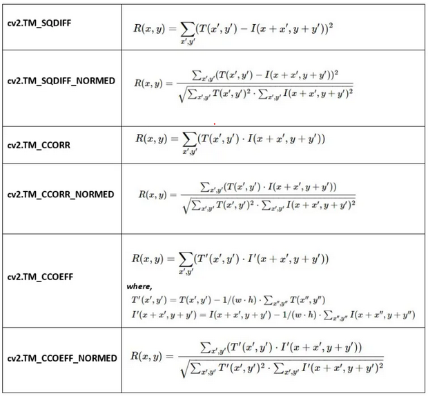 - Ảnh template sẽ được so sánh với cửa sổ trượt tương ứng trên ảnh đầu vào bằng một công thức. Một số phương pháp so sánh được hỗ trợ trong opencv được cho ở hình dưới
