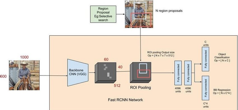 Fast R-CNN: Selective Search Algorithm → 2000 proposal regions → Đưa cả ảnh qua CNN tạo feature map → Ánh xạ proposal regions vào vị trí tương ứng trên feature map → ROI Pooling → Fully Connected → Classification ảnh + Adjust bouding box