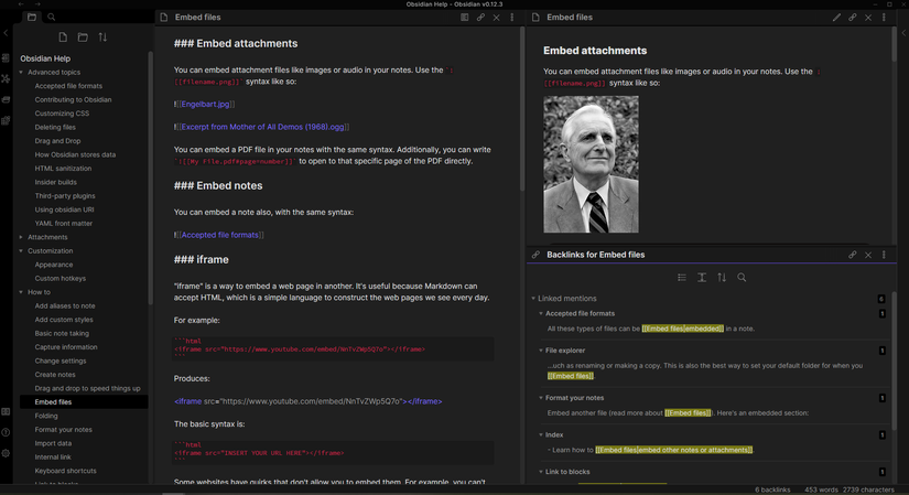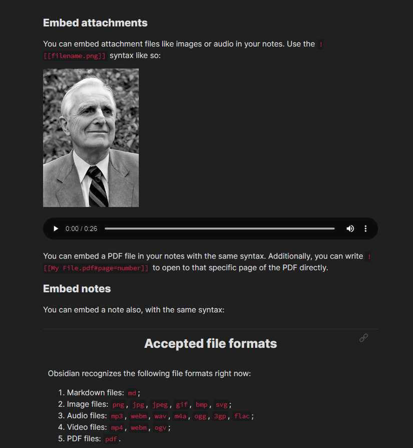 Tích hợp các file hình ảnh (chỉ cần paste và nó sẽ tự động tạo mới file ảnh Pasted image XXXX.png, âm thanh (record trực tiếp vào file lưu trữ), file PDF. Khi đổi tên hoặc di chuyển file, các note có link đến file này cũng sẽ được tự động cập nhật.