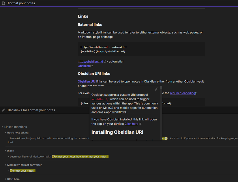 Mỗi dòng từ, tiêu đề trong Obsidian được gọi là một block (hoặc bullet-point trong RoamResearch). Bạn có thể click vào hình tam giác bên trái để fold/unfold các block này. Obsidian cho phép liên kết với các nội dung khác trong Vault thông qua cú pháp link: [[Internal links]] hoặc đến từng block. Ta cũng có thể hover qua để xem nhanh nội dung link, click để di chuyển đến link đó.