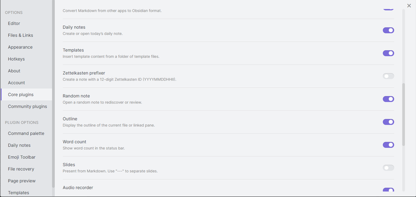 Obsidian có sẵn các core plugin cho phép chúng ta mở rộng chức năng hơn nữa: