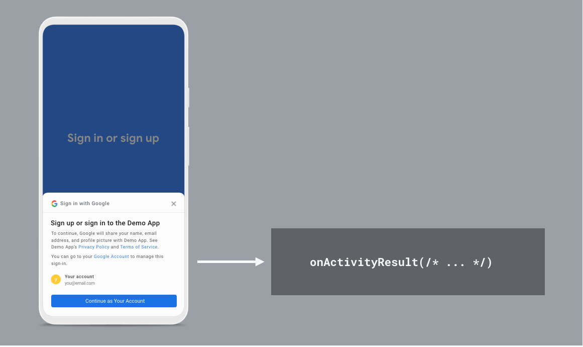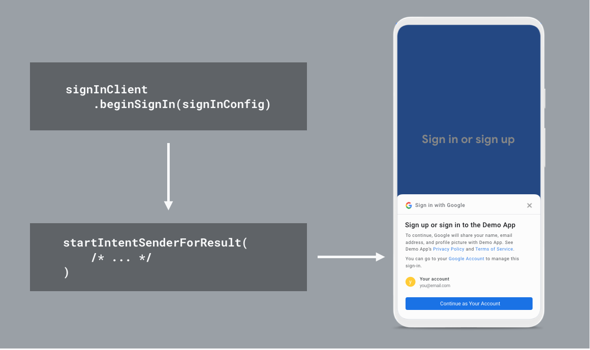 Cuộc gọi lại từ beginSignIn sẽ gửi PendingIntent để hiển thị overlay khi khởi chạy. Sau đó, bạn gọi startIntentSenderForResult với PendingIntent được cung cấp để hiển thị cửa sổ đăng nhập thông qua activity hiện tại.