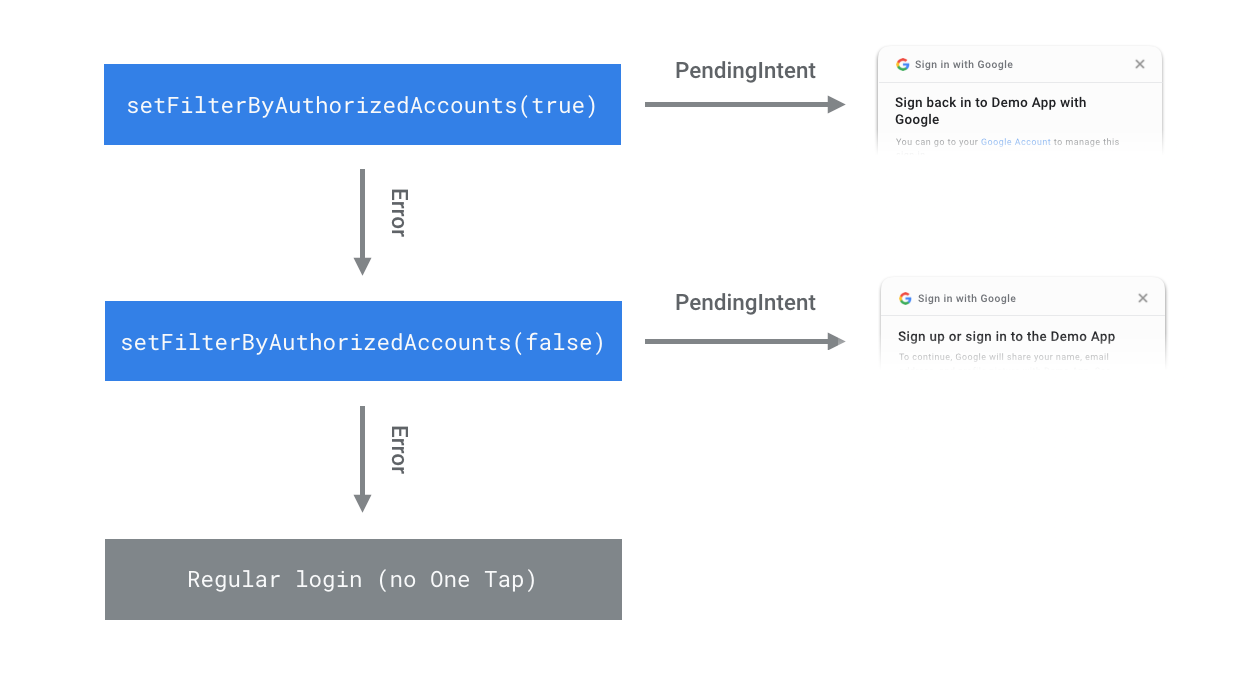 Nếu One Tap không tìm thấy bất kỳ tài khoản được ủy quyền nào để đăng nhập, beginSignIn sẽ gọi failure listener thay vì chuyển cho ứng dụng một PendingIntent. Khi điều này xảy ra, bạn nên lặp lại truy vấn nhưng lần này hãy tìm các tài khoản có thể được sử dụng để đăng ký.