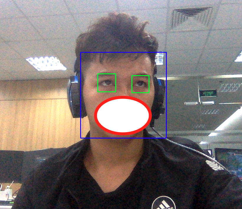 Ở đây, chúng tôi đang tìm kiếm khuôn mặt, kích thước của chúng, vẽ hình chữ nhật và lưu ý ROI. Tiếp theo, chúng tôi detect ra mắt ở trên khuôn mặt đó :