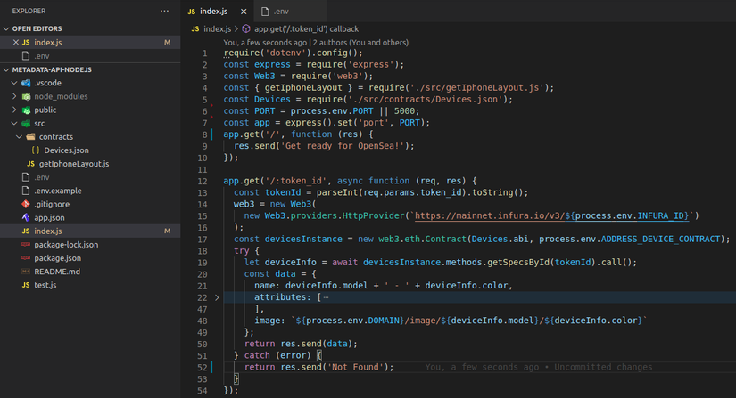 Giờ sẽ đi làm một hàm để từ token_id ta có thể get ra được các thông tin của mặt hàng ở trên contract. Do hàm get info của mặt hàng từ contract chỉ là hàm view nên không cần phải ký bằng private key, mà đơn giản chúng ta cần thông qua một node Ethereum để gọi như ở đây mình đang sử dụng node của Infura. Và sau khi get được thông tin mình sẽ set chúng vào các trường tương ứng để nó có thể hiển thị được trên OpenSea.