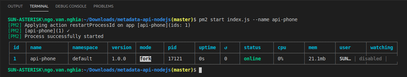sau đó chạy nó với file index.js của chúng ta cùng với tên của nó để phân biệt với các ứng dụng khác