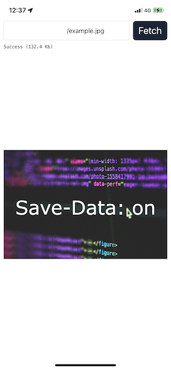 When we’ve detected that reduced-size assets are desired, as described above, we add a request header Save-Data: on to each HTTP request that we send. If regular-sized assets are desired, we omit this header altogether. The sample app uses the Apple URL Loading System, embodied by NSURLSession and NSURLSessionTask objects, to load web-hosted assets. All we need to do is configure an NSURLSession object with the additional request header field as required, as shown in this code snippet: