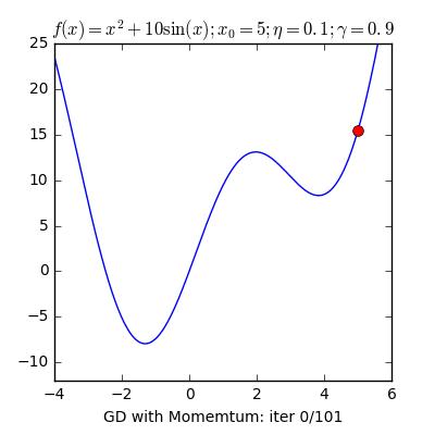 Qua 2 ví dụ minh họa trên của hàm f(x) = x.2 + 10sin(x), ta thấy GD without momentum sẽ hội tụ sau 5 vòng lặp nhưng không phải là global minimum. Nhưng GD with momentum dù mất nhiều vòng lặp nhưng nghiệm tiến tới global minimum, qua hình ta thấy nó sẽ vượt tốc tiến tới điểm global minimum và dao động qua lại quanh điểm đó trước khai dừng lại.