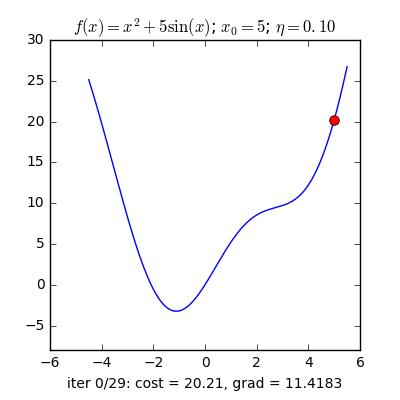 Qua các hình trên ta thấy Gradient descent phụ thuộc vào nhiều yếu tố : như nếu chọn điểm x ban đầu khác nhau sẽ ảnh hưởng đến quá trình hội tụ; hoặc tốc độ học (learning rate) quá lớn hoặc quá nhỏ cũng ảnh hưởng: nếu tốc độ học quá nhỏ thì tốc độ hội tụ rất chậm ảnh hưởng đến quá trình training, còn tốc độ học quá lớn thì tiến nhanh tới đích sau vài vòng lặp tuy nhiên thuật toán không hội tụ, quanh quẩn quanh đích vì bước nhảy quá lớn.