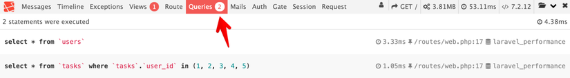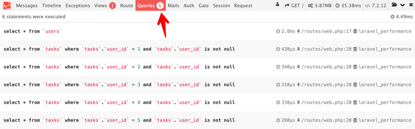 Điều đầu tiên bạn có thể nhận thấy là trang sẽ không tải vì PHP sẽ hết bộ nhớ (ví dụ: “Allowed memory size of X bytes exhausted”). Vì vậy, để bắt đầu xem xét vấn đề này, chúng ta sẽ check truy vấn SQL được tạo bởi Laravel: