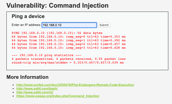 Như bạn thấy ở đoạn code trên, không hề có bất cứ sự chuẩn hoá nào với tham số ip được gửi lênh. Ứng dụng sẽ sử dụng giá trị này và truyền vào câu lệnh shell. Giá trị trả về sẽ được in ra màn hình.