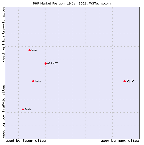 có đến 79% website đang sử dụng PHP. Các công cụ thống kê thường quét X-Powered-By, vì lý do bảo mật nên một số nhà cung cấp hosting xóa header này nên trên thực tế mình nghĩ tỉ lệ này cao hơn. Một điểm nữa dẫn đến sự áp đảo này đó là các mã nguồn mở như Wordpress, Drupal, Joomla rất phổ biến đều sử dụng PHP. Với sự xuất hiện của nhiều ngôn ngữ mới, tỉ lệ này có giảm một chút (80,1% năm 2016) tuy nhiên vẫn còn rất cao, chứng minh rằng những website PHP cũ cũng không hề chuyển đổi sang công nghệ khác. Vì sao vậy?