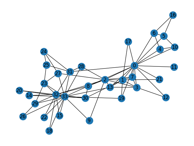 Ở đây thì mình sẽ sử dụng NetworkX để minh hoạ các khái niệm này cho dễ hiểu. Trong phần này, mình sẽ lấy một dataset có sẵn trong NetworkX để minh hoạ nhé, đó là Zachary's karate club network. Đây là một Social Graph gồm 34 nodes (chỉ 34 thành viên) của một câu lạc bộ võ Karate. Để minh hoạ cho các khái niệm này thì sẽ tốt hơn nếu lấy một ví dụ của một Graph có nhiều node một xíu, vậy nên mình chọn đây làm ví dụ.