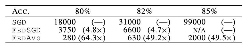 Ở đây giải thuật FEDSGD tương ứng với FEDAVG với và . Qua kết quả trên ta có thể thấy việc tăng khối lượng tính toán ở phía client có thể làm giảm số round cần thiết để thu được độ chính xác mong muốn.