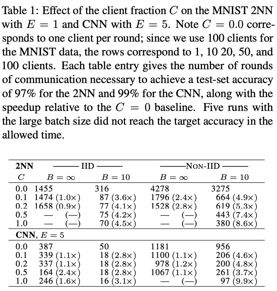 Mỗi ô trong bẳng là số round cần thiết để thu được độ chính xác test 97% với NN và 99% với CNN. Các ô không có kết quả là các thử nghiệm vượt quá thời gian cho phép. Từ kết quả này, ta thấy được với , số lượng round cần thiết giảm đáng kể. Ngoài ra, cho số lượng round cần thiết tốt trong khi cân bằng với việc tính toán hiệu quả. Vì vậy, trong hầu hết các thí nghiệm sau, tác giả cố định .