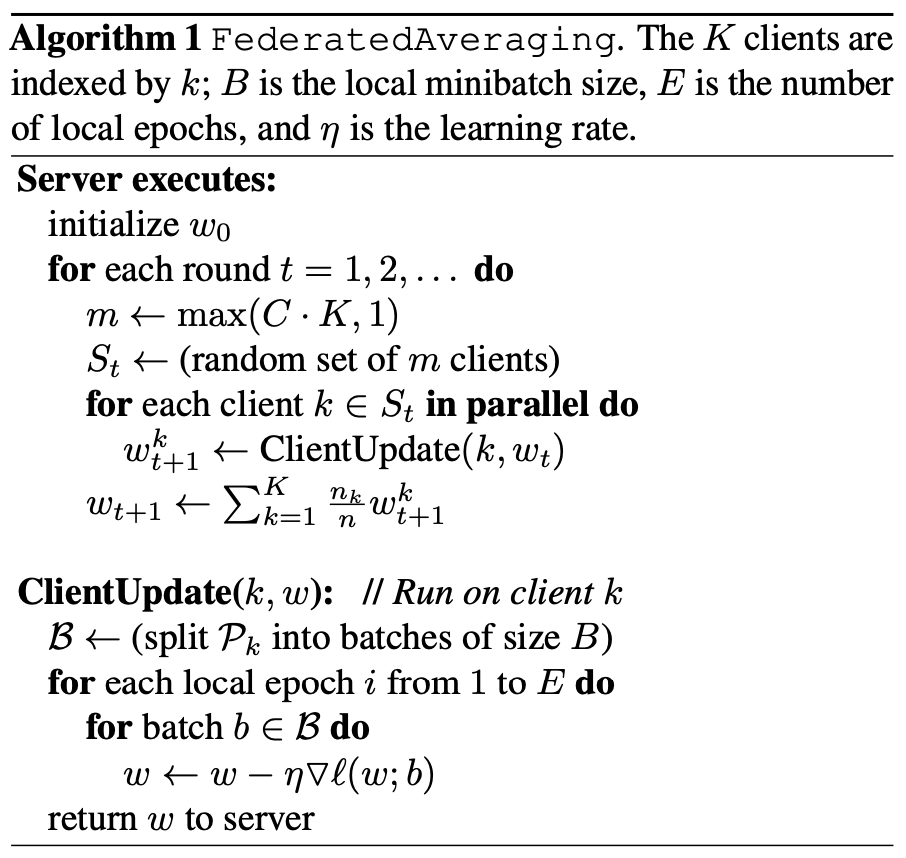 Tác giả đề xuất phương pháp Tối ưu liên kết (Federated optimization). Phương pháp này mô tả cụ thể những việc mà server và client sẽ phải thực hiện và thông tin được truyền đi giữa server và client. Độ hiệu quả của phương pháp này trực tiếp quyết định đến tính riêng tư và số vòng(round) cần update để thu được độ chính xác nhất mong muốn. Cụ thể tác giả giới thiệu giải thuật FederatedAveraging, giải thuật này thực hiện tối ưu trên client bằng stochastic gradient descent(SGD) và thực hiện lấy trung bình mô hình ở phía server. Chi tiết giải thuật được mô tả dưới đây: