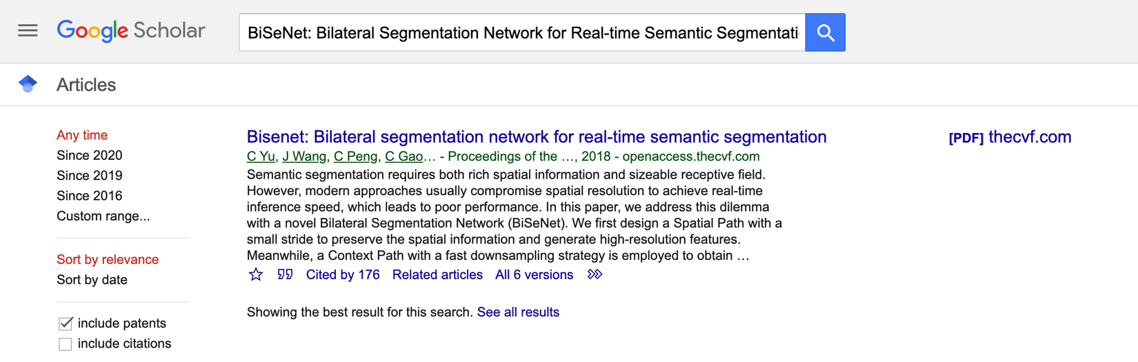 Paper ngày hôm nay chúng ta tìm hiểu đó là BiSeNet: Bilateral Segmentation Network for Real-time Semantic Segmentation. Đây là một paper rất hay trong lĩnh vực segmentation real time. Các bạn có thể tìm thấy paper này ở đây. Trước khi tìm hiểu một paper nào đó để tránh khỏi việc dẫm phải các shit paper khiến chúng ta hoang mang, mất thời gian mà không đem lại kết quả gì thì chúng ta cần phải tìm hiểu xem paper này có đáng để đọc không đã nhé.
