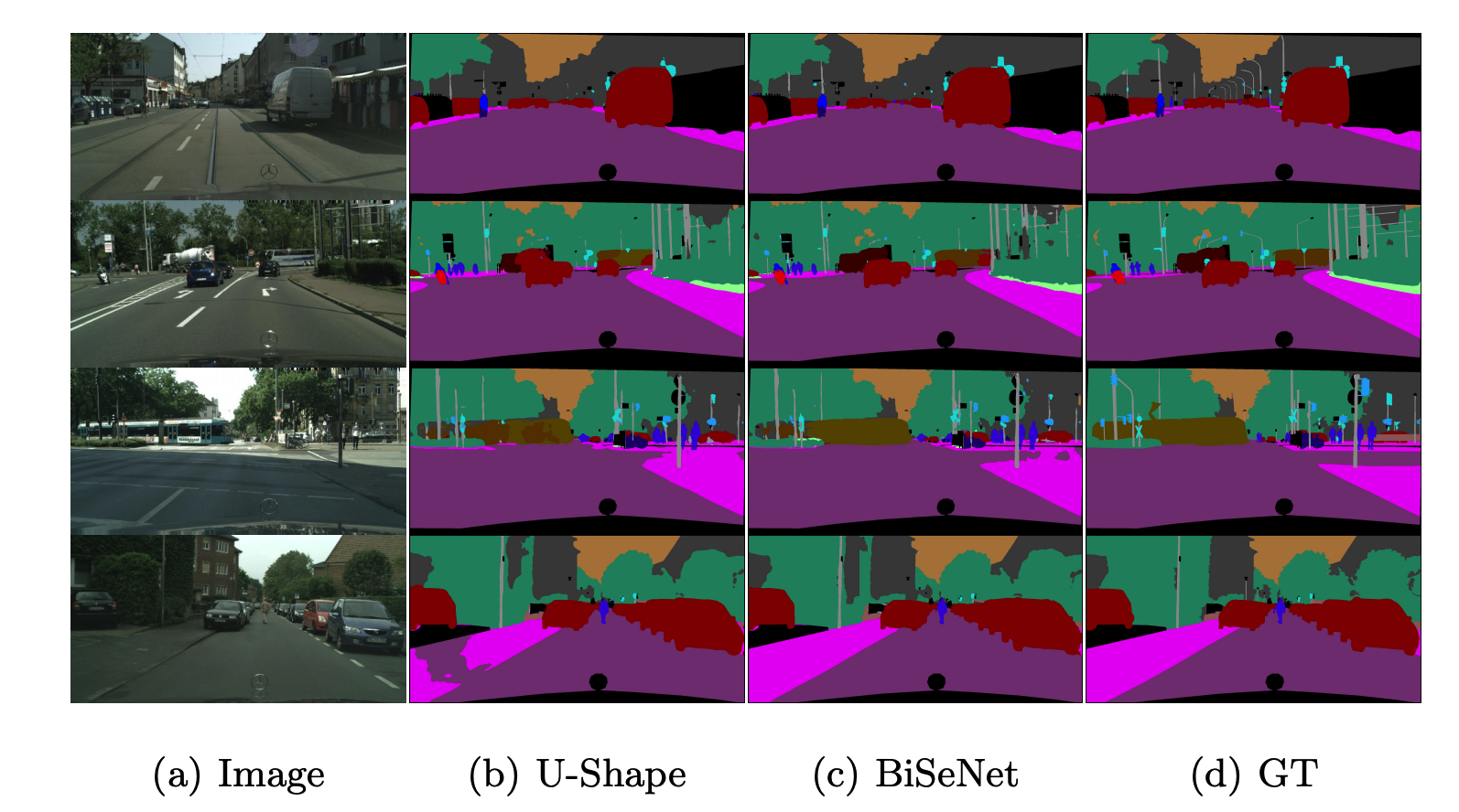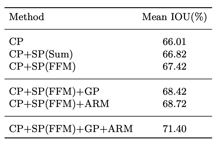 Có thể thấy chất lượng của mô hình BiSeNet cũng cho kết quả tương đương với cấu trúc Unet. Sau đây là mức độ ảnh hưởng của các thành phần trong mạng. Có thể thấy khi kết hợp đủ các thành phần trong mạng thì cho kết quả mIOU tốt nhất là 71.4%