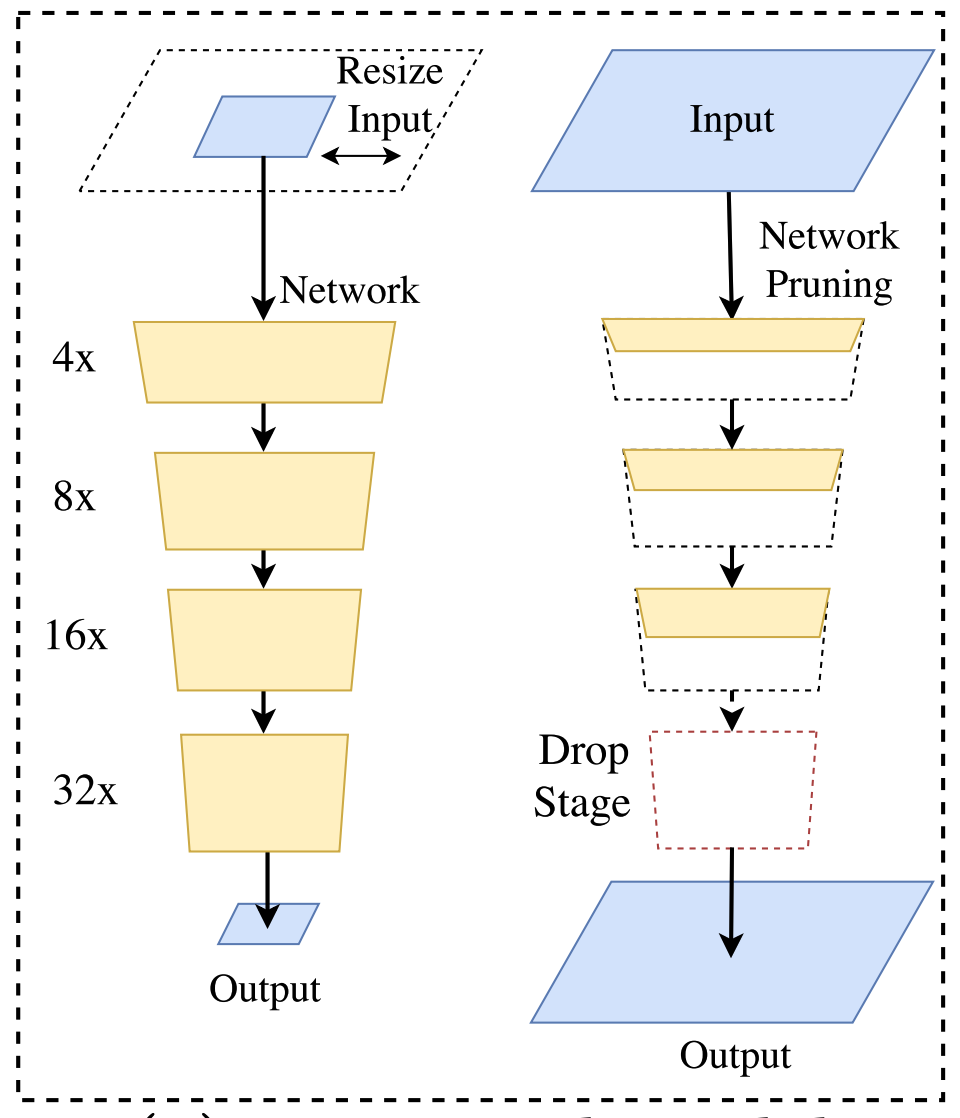 Note tất cả các phương pháp kể trên đều đánh đổi độ chính xác để cải thiện tốc độ. Có thể hình dung hoạt động của các model trong figure dưới. Mạng bên trên trái thể hiện cropping và resize trên image size. Mạng bên phải thể hiện thao tác cắt tỉa mạng và drop các last stage.