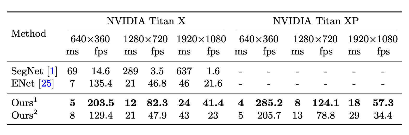 Tốc độ của phương pháp này đạt được cũng khá đáng nể với cùng một kích thước ảnh đầu vào thì tốc độ của phương pháp này đều vượt trội hơn các phương pháp khác kể cả Enet