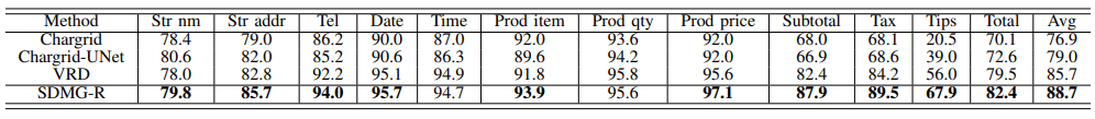 Có thể thấy rằng SDMG-R vượt trội hơn tất cả các model còn lại. Cụ thể, SDMGR đạt F1-score tính trung bình trên 12 loại giá trị trên WildReceipt lớn hơn 11,8%, 9,7% và 3% so với Chargrid, Chargerid-UNet và VRD tương ứng. Hơn nữa, SDMG-R đạt F1-score cao nhất cho 10 trong số 12 hạng mục. SDMG-R vượt trội hơn rất nhiều so với Chargerid-UNet,đó là do sự liên kết giữa các text xa nhau được học thông qua đồ thị.