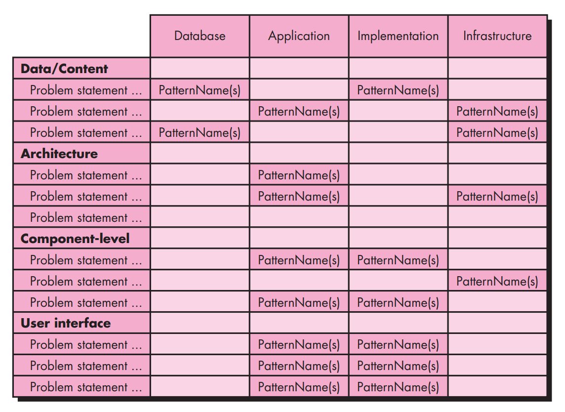 The requirements model is examined in order to isolate the hierarchical set of problems to be solved. The problem space is partitioned so that subsets of problems associated with specific software functions and features can be identified. Problems can also be organized by type: architectural, componentlevel, algorithmic, user interface, etc. Once a subset of problems is defined, one or more pattern repositories are searched to determine if an existing design pattern, represented at an appropriate level of abstraction, exists. Patterns that are applicable are adapted to the specific needs of the software to be built. Custom problem solving is applied in situations for which no patterns can be found.