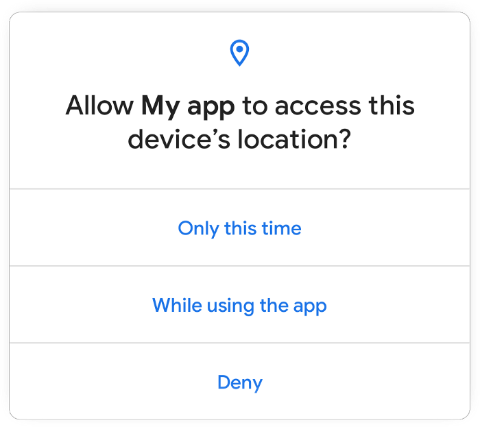 Kể từ Android 11, khi ứng dụng của bạn yêu cầu quyền truy cập tới location, microphone, hoặc camera hộp thoại cho người dùng sẽ có thêm một lựa chọn là "Chỉ một lần". Nếu người dùng chọn lựa chọn này, ứng dụng của bạn sẽ được cấp quyền tạm thời hay còn gọi là one-time permission.