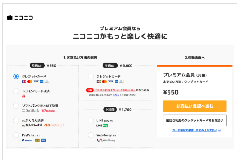 Chế độ hội viên Premium mỗi tháng thu 500¥ (chưa gồm thuế) có tới 1.590.000 người (tính tới hiện tại là cuối tháng 9 năm 2020) tham gia, và là dịch vụ thu phí chủ yếu đem lại công việc kinh doanh của Niconico. Niconico bắt đầu dịch vụ vào năm 2006 và bắt đầu mở dịch vụ hội viên premium vào năm 2007.