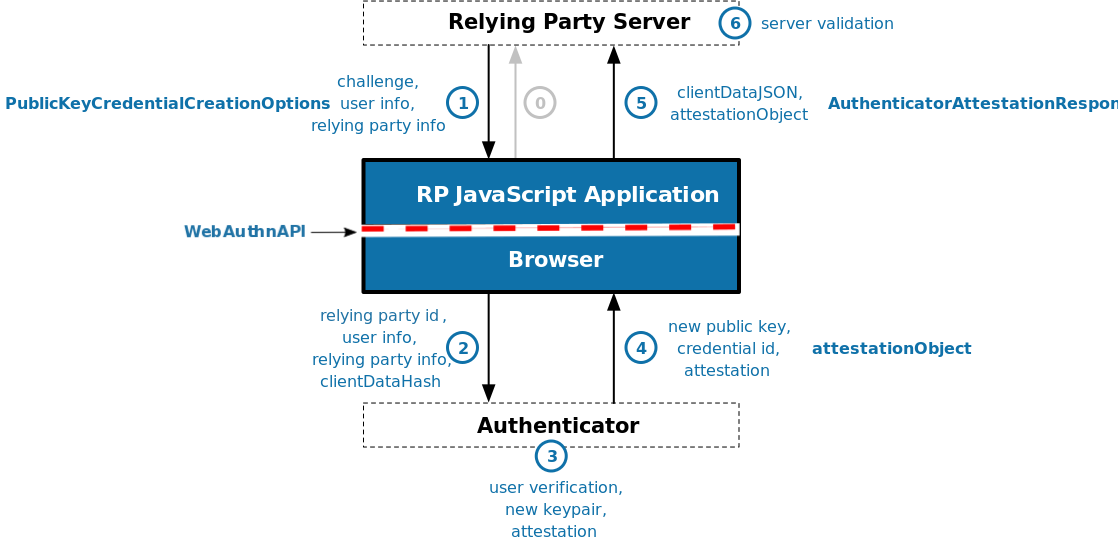 Đầu tiên là Đăng ký, trong đó thông tin xác thực public-key được tạo trên trình xác thực và nằm trong phạm vi bên tin cậy có tài khoản của người dùng hiện tại (Tài khoản có thể đã tồn tại hoặc có thể được tạo tại thời điểm này).