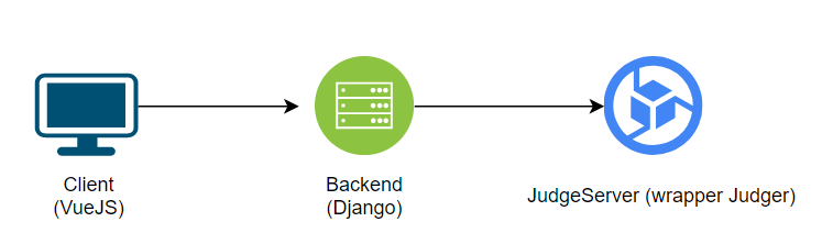 Luồng: Client gửi request kèm data cần thiết -> Backend get thông tin giới hạn tài nguyên và request sang JudgeServer -> JudgeServer gọi Judger ra chạy code -> Chạy thành công hay lỗi thì phản hồi lại Backend -> Backend xử lý rồi gửi lại frontend.