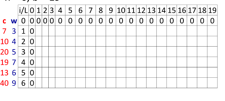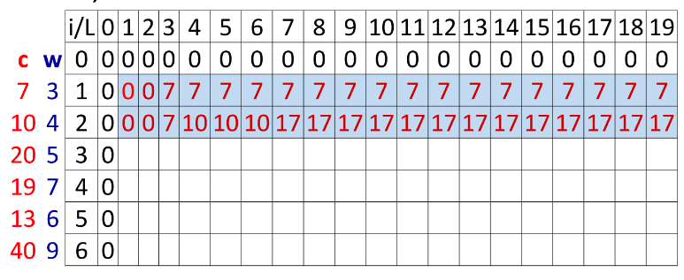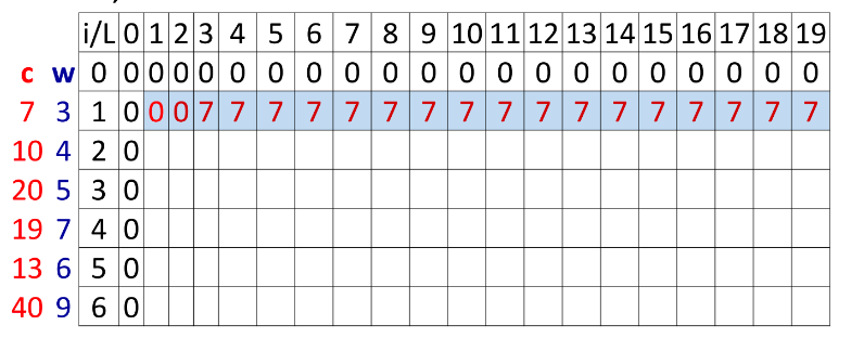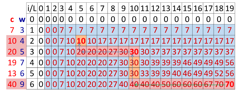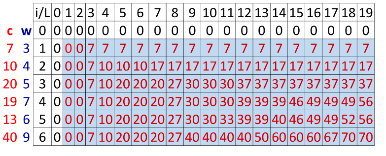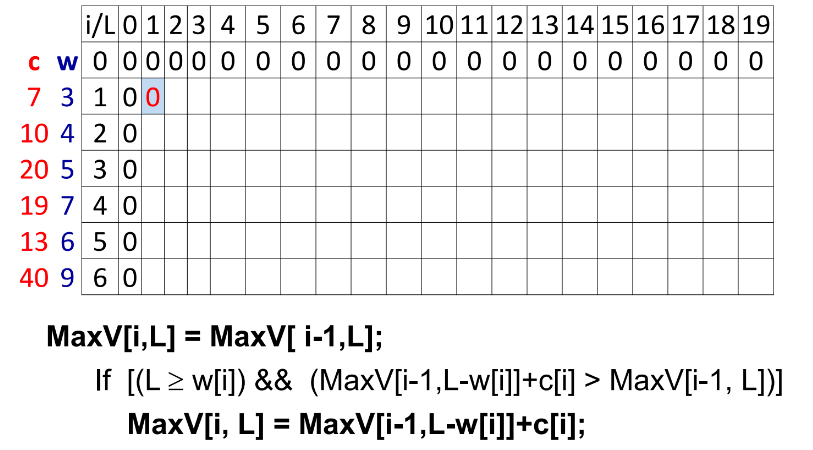 MaxV[i, L] = MaxV[i-1,L-w[i]]+c[i] ;