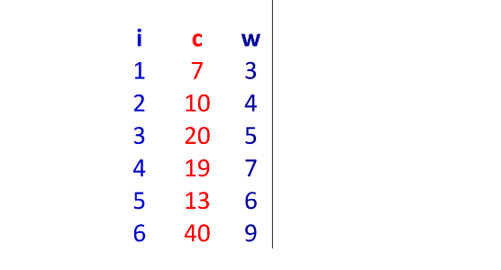 Cho 6 đồ vật (n = 6), và túi có trọng lượng b = 19. Các đồ vật có trọng lượng và giá trị như sau: