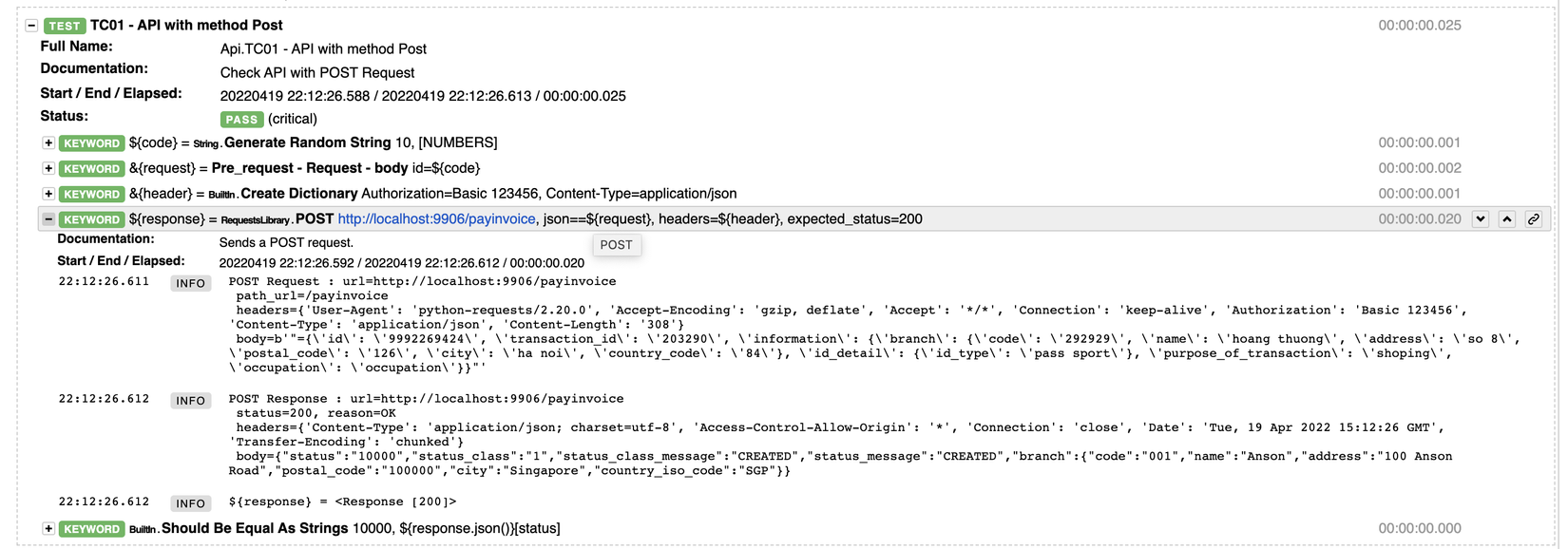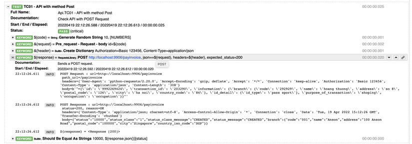 sau đó mình sẽ gọi POST ( POST này được define trong thư viện RequestsLibrary ) sẽ gửi API tới host http://localhost:9906/payinvoice và với body