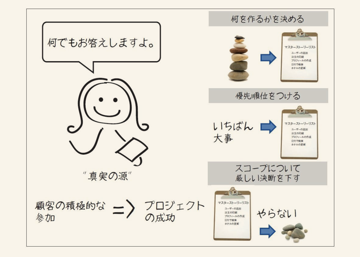 Mặc dù vậy, khách hàng sẽ không quyết định một cách độc đoán về độ ưu tiên của mỗi task, mà có sự tham khảo ý kiến của development team. Ví dụ như, vì lý do kỹ thuật thì task này nên thực hiện trước task kia thì project sẽ tiến triển thuận lợi hơn, thì development team cần giải thích rõ và đề xuất cho khách hàng. (hoặc là vì, có những lý do kỹ thuật cần phải được trước.)