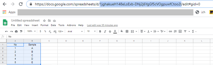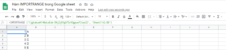 - Ví dụ: =IMPORTRANGE ("1jghakueH148eLoExb-DNj2j6YgGf5cVOgpuwfCtoo2I", "Sheet1!A2:B6")