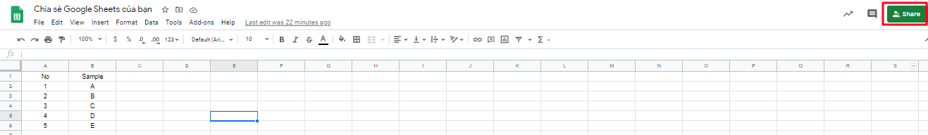 Step 1: mở trang Google Sheets, click con trỏ chuột vào số hoặc chữ của dòng/cột đó.