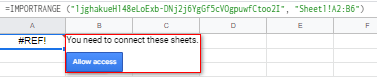 Lưu ý: sẽ có 1 popup nhỏ show ra yêu cầu chúng ta connect với sheet mà chúng ta muốn lấy dữ liệu. Bạn chỉ việc chọn Access allow là dữ liệu của sheet đó sẽ được chuyển sang sheet hiện tại theo như công thức.