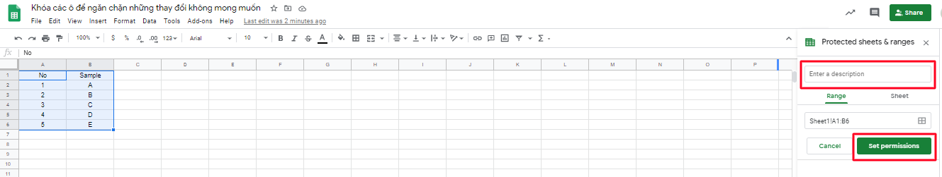 Step 3: thanh tuỳ chọn Protect Sheets and Ranges sẽ xuất hiện ở bên phải cửa sổ. Tại đây, bạn có thể nhập một dòng mô tả ngắn gọn về lý do cần khoá ở ô Enter a description