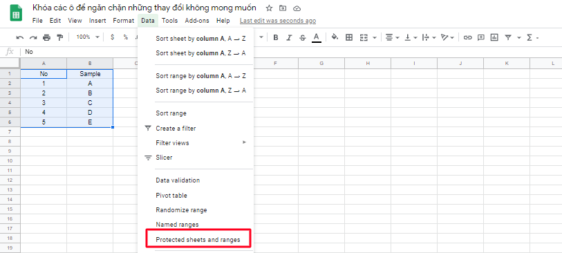 Step 2: trên thanh công cụ chọn Data > Protected sheets and ranges