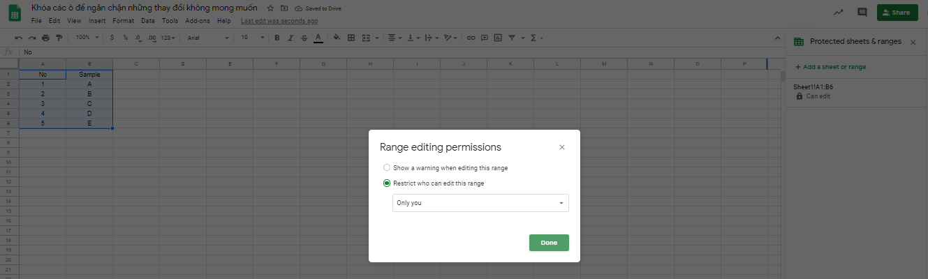 Step 5: sau khi thiết lập quyền xong nhấn Done là xong. Nếu muốn show warning khi người khác edit thì sẽ check vào Show a warning when editing this range