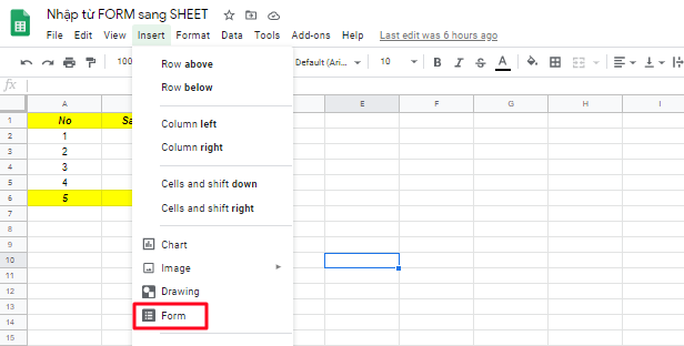 Step 1: tại thanh công cụ của Google spread sheets chọn Insert > Form