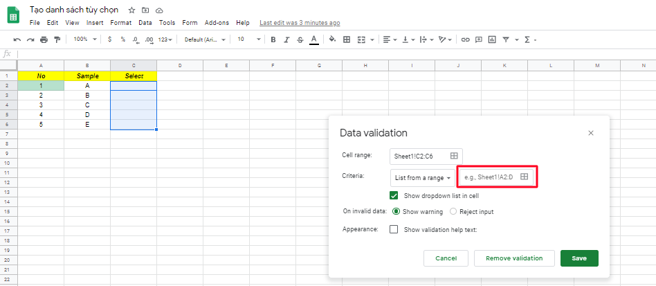 Step 3: sau đó sẽ show ra các popup với title Data validation như dưới đây và bạn có thể setting danh sách tùy chọn bằng cách click vào ô màu đỏ.