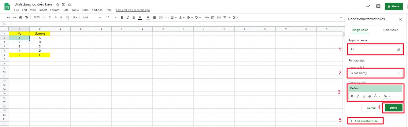 Step 2: sau đó bên phải sẽ xuất hiện giao diện màn hình khung Conditional format rules để thiết lập các điều kiện cho dữ liệu.