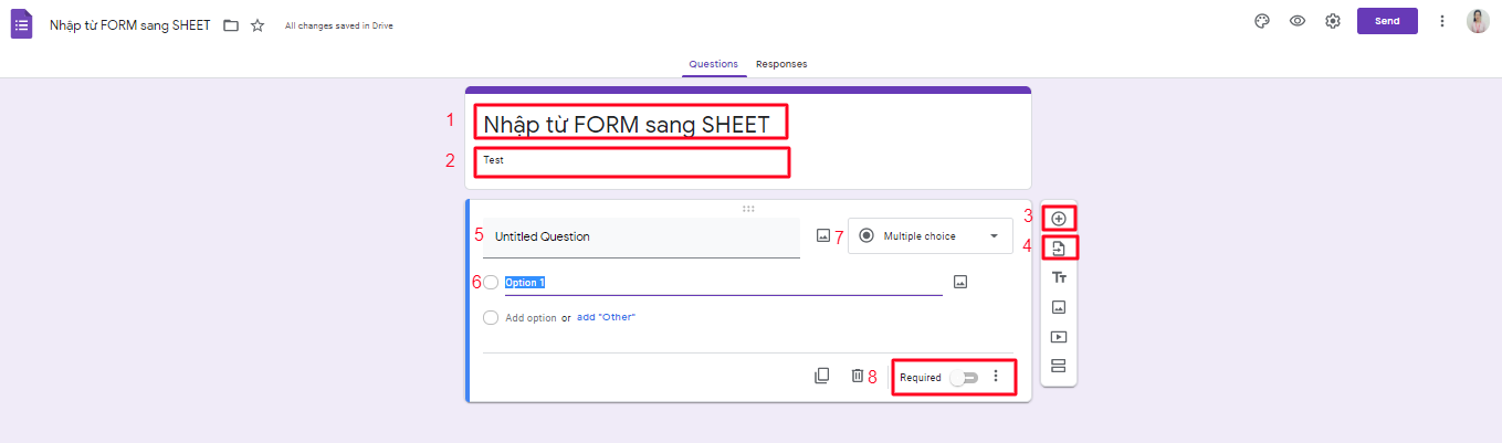 Giải thích các item: 1: title của form (title này default sẽ được lấy theo title của google sheet) 2: description của form 3: add thêm câu hỏi 4: import form 5: chỗ để input câu hỏi 6: chỗ để input câu trả lời 7: phương thức trả lời câu hỏi 8: thiết lập xem câu trả lời có bắt buộc hay không? Nếu câu trả lời là bắt buộc thì bật chức năng này lên