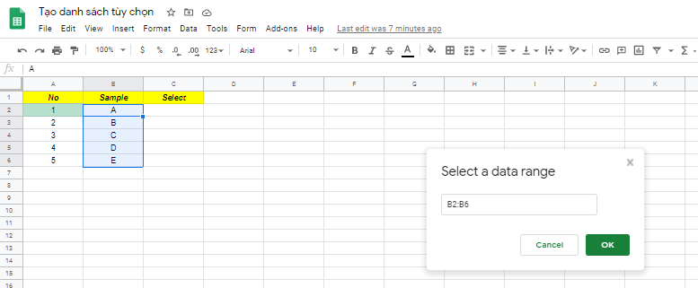 Step 4: sau khi click ô đỏ sẽ lại hiển thị ra 1 popup với title Select a data range và bạn sẽ select phạm vi danh sách tùy chọn bạn muốn > nhấn OK > nhấn Save là setting hoàn thành.